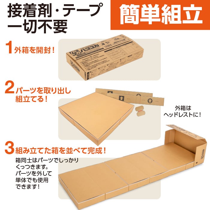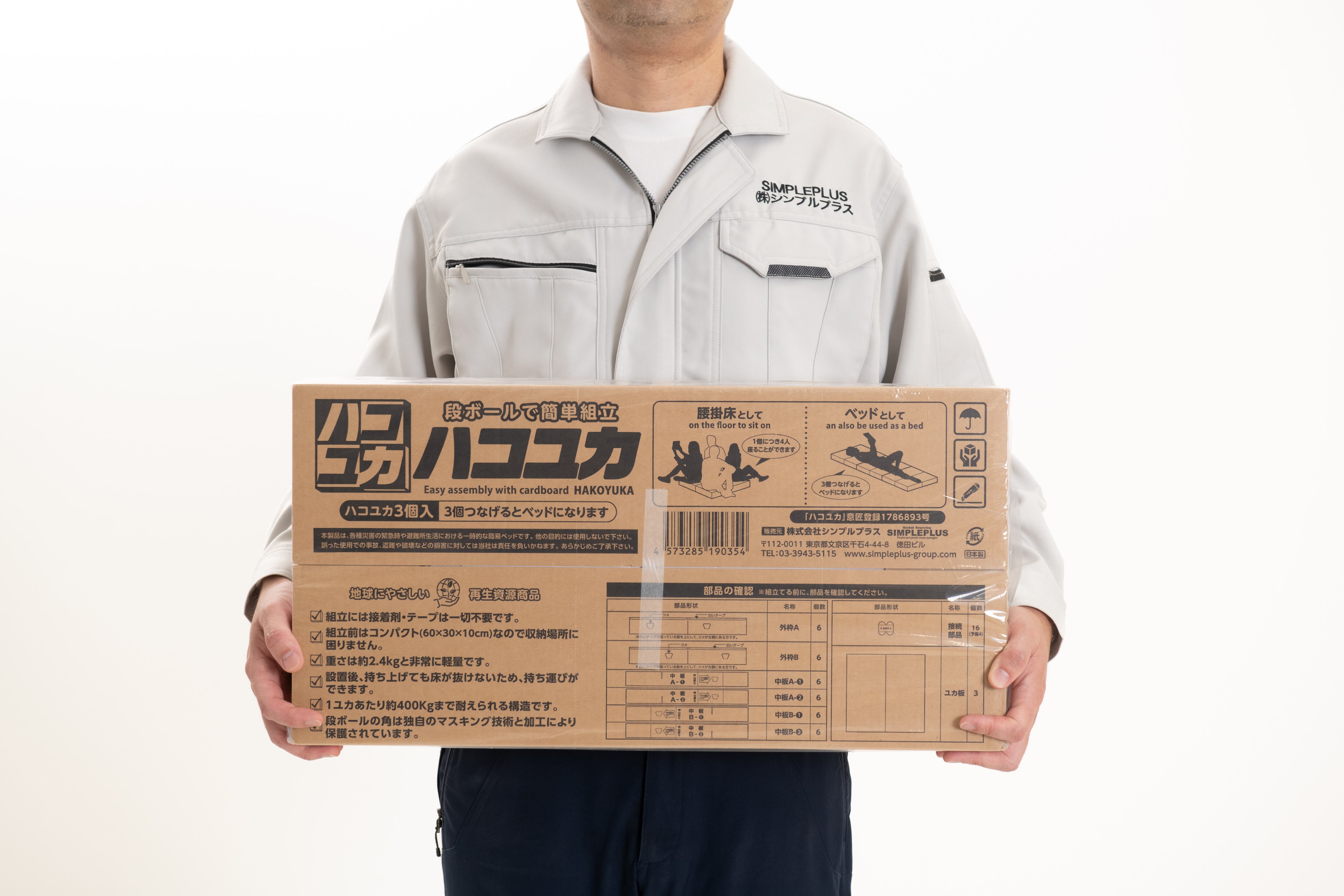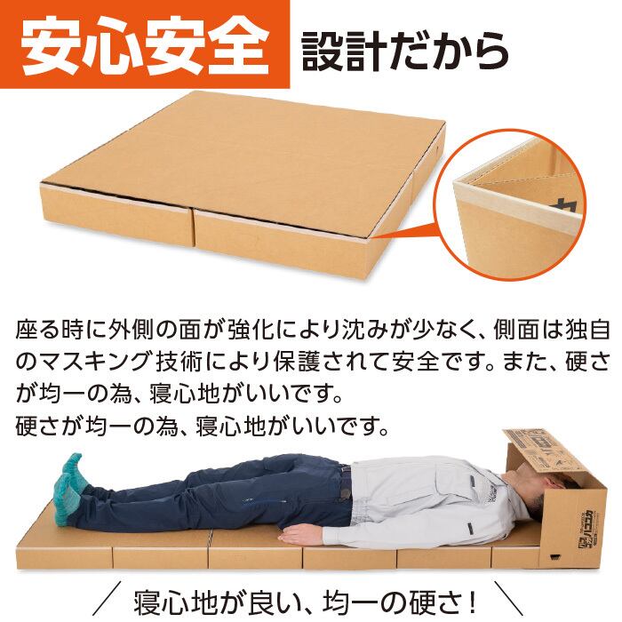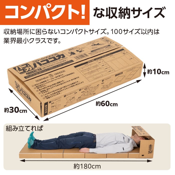 脱炭素をテーマに開発しました。業界最小クラスのサイズに特化いたしました。また2.4kgと軽く持ち運びが楽です。1辺60cm高さ約10cmの正方形型床です。この正方形型床が3個入ってます。この正方形型床は椅子が無い時に腰掛る事ができ、3つ繋げるとロータイプのベットになります。高さが無いので快適ではありません。